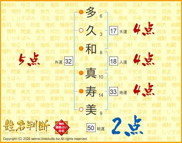 多(6画)久(3画)和(8画) 真(10画)寿(14画)美(9画)