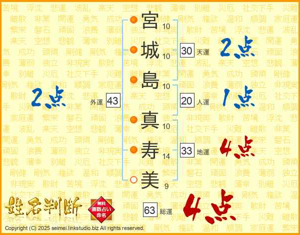 宮(10画)城(10画)島(10画) 真(10画)寿(14画)美(9画)