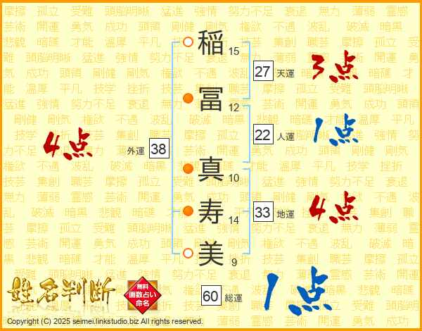 稲(15画)冨(12画) 真(10画)寿(14画)美(9画)