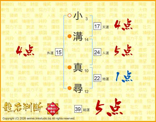 生活面を象徴する運勢です。外部から受ける影響力を表し、結婚運、家庭運や職場、環境への順応性を表します。総運から人運を引いた画数。姓や名が1文字の場合を除く。