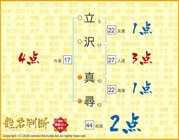 生活面を象徴する運勢です。外部から受ける影響力を表し、結婚運、家庭運や職場、環境への順応性を表します。総運から人運を引いた画数。姓や名が1文字の場合を除く。