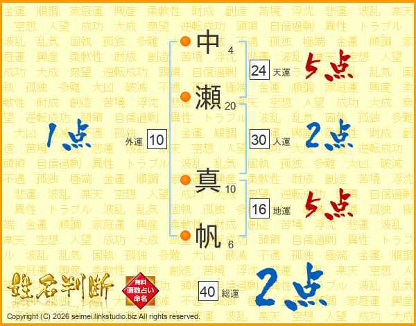 中(4画)瀬(20画) 真(10画)帆(6画)