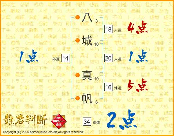 生活面を象徴する運勢です。外部から受ける影響力を表し、結婚運、家庭運や職場、環境への順応性を表します。総運から人運を引いた画数。姓や名が1文字の場合を除く。