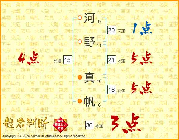 河(9画)野(11画) 真(10画)帆(6画)