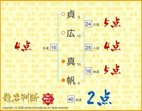 生活面を象徴する運勢です。外部から受ける影響力を表し、結婚運、家庭運や職場、環境への順応性を表します。総運から人運を引いた画数。姓や名が1文字の場合を除く。