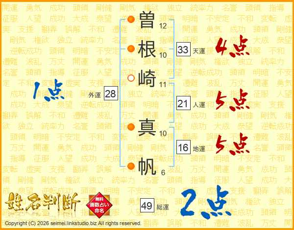 曽(12画)根(10画)崎(11画) 真(10画)帆(6画)