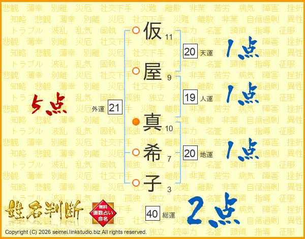 仮(11画)屋(9画) 真(10画)希(7画)子(3画)