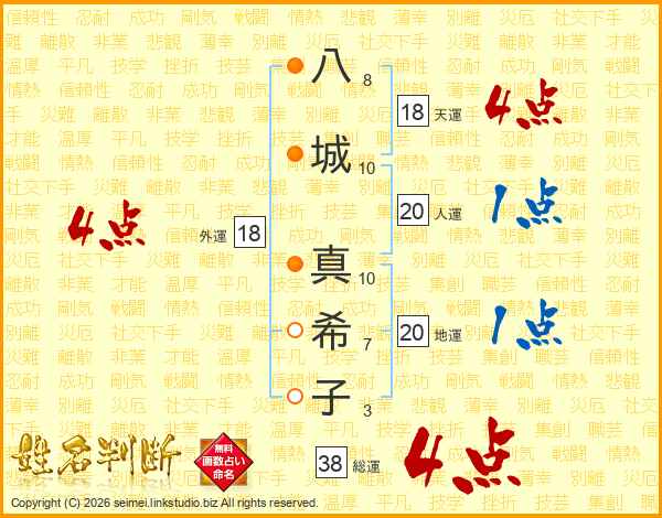 八(8画)城(10画) 真(10画)希(7画)子(3画)