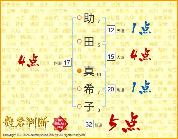 助(7画)田(5画) 真(10画)希(7画)子(3画)
