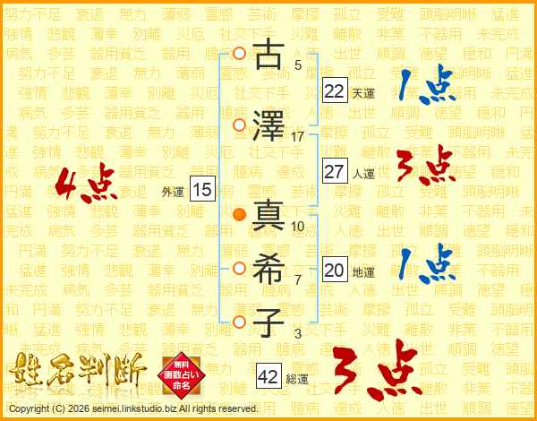 古(5画)澤(17画) 真(10画)希(7画)子(3画)