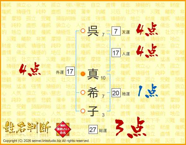 呉(7画) 真(10画)希(7画)子(3画)