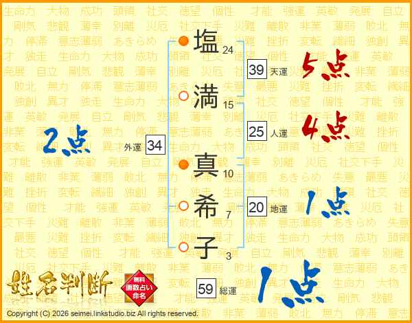 塩(24画)満(15画) 真(10画)希(7画)子(3画)
