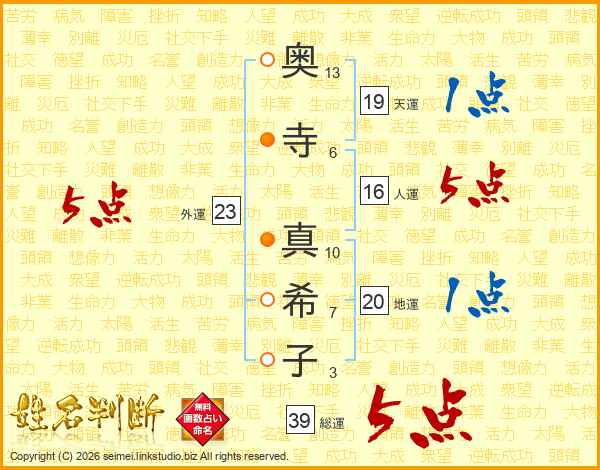 奥(13画)寺(6画) 真(10画)希(7画)子(3画)