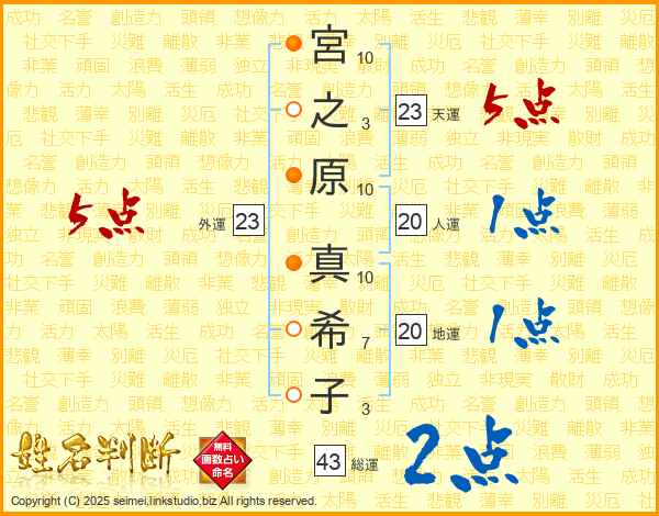 宮(10画)之(3画)原(10画) 真(10画)希(7画)子(3画)