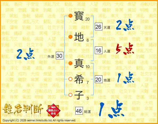 寳(20画)地(6画) 真(10画)希(7画)子(3画)