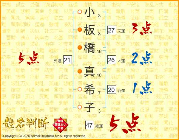 小板橋真希子さんの総運は47画の5点!