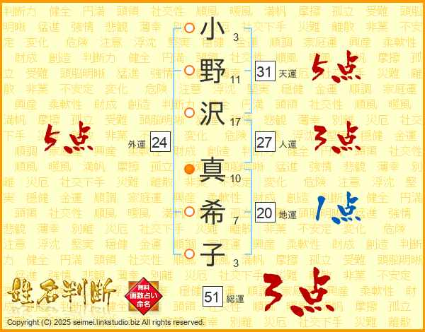 小野沢真希子さんの天運は31画の5点!