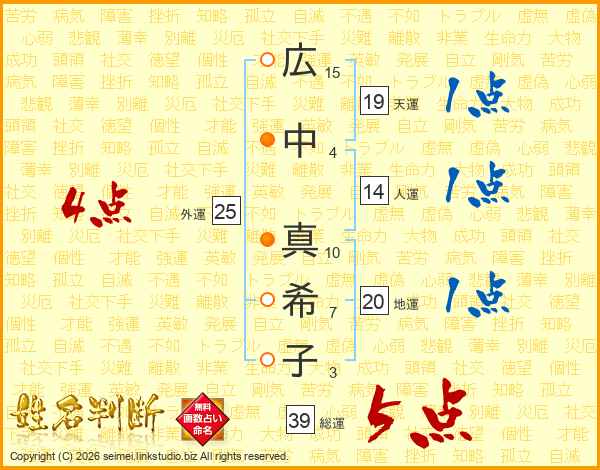 広(15画)中(4画) 真(10画)希(7画)子(3画)
