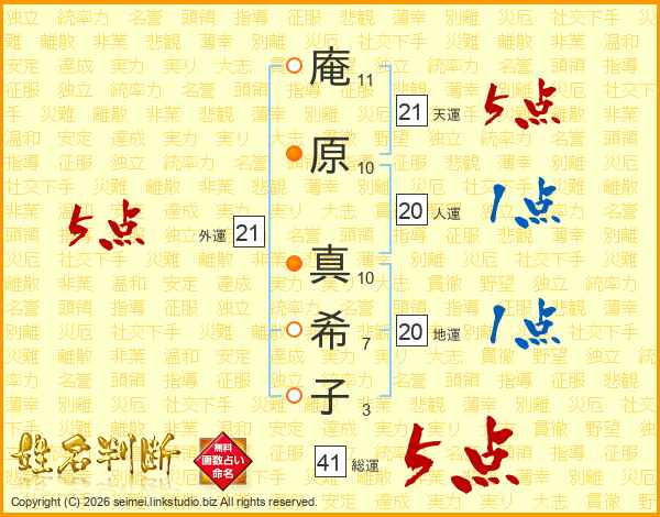 庵(11画)原(10画) 真(10画)希(7画)子(3画)
