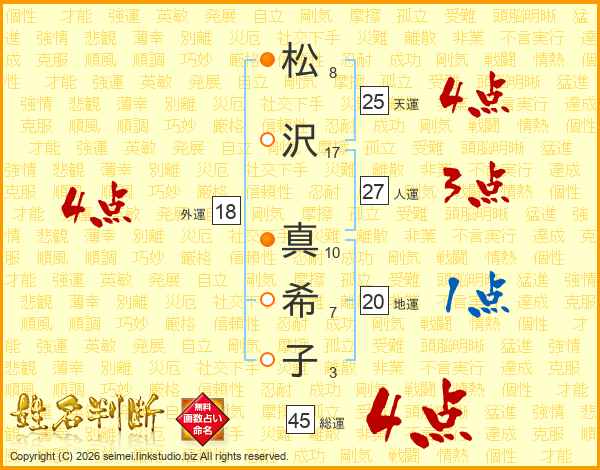 松(8画)沢(17画) 真(10画)希(7画)子(3画)
