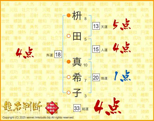 枡(8画)田(5画) 真(10画)希(7画)子(3画)