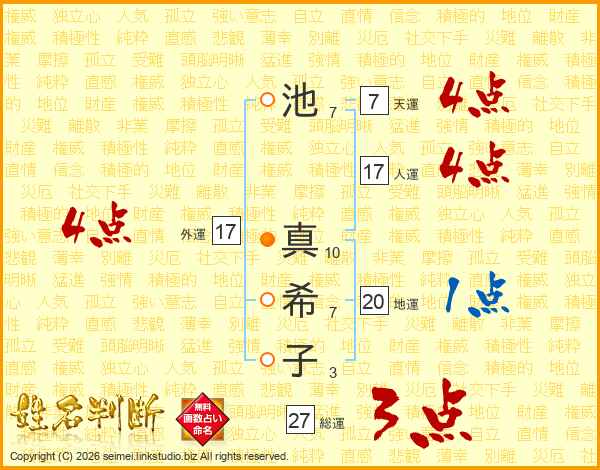 生活面を象徴する運勢です。外部から受ける影響力を表し、結婚運、家庭運や職場、環境への順応性を表します。総運から人運を引いた画数。姓や名が1文字の場合を除く。