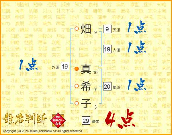 畑(9画) 真(10画)希(7画)子(3画)