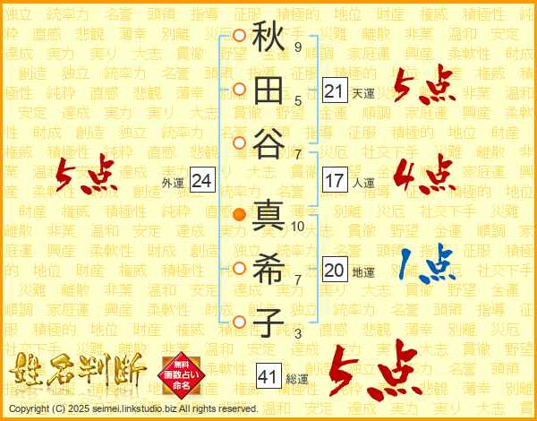 秋(9画)田(5画)谷(7画) 真(10画)希(7画)子(3画)