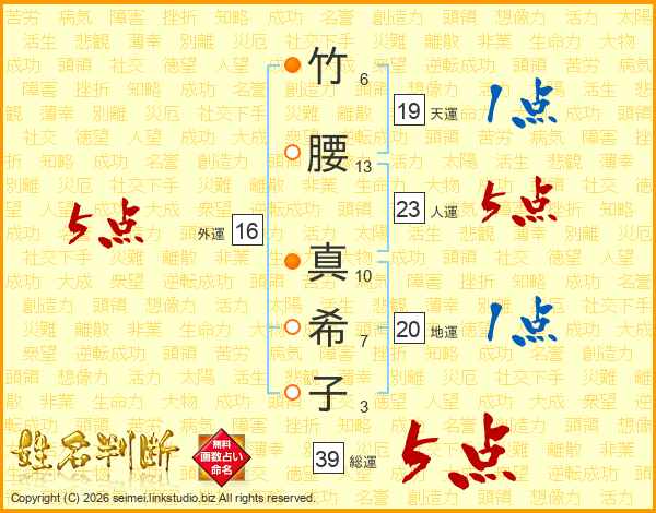 竹(6画)腰(13画) 真(10画)希(7画)子(3画)