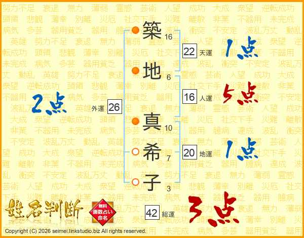 築(16画)地(6画) 真(10画)希(7画)子(3画)