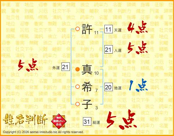 許(11画) 真(10画)希(7画)子(3画)