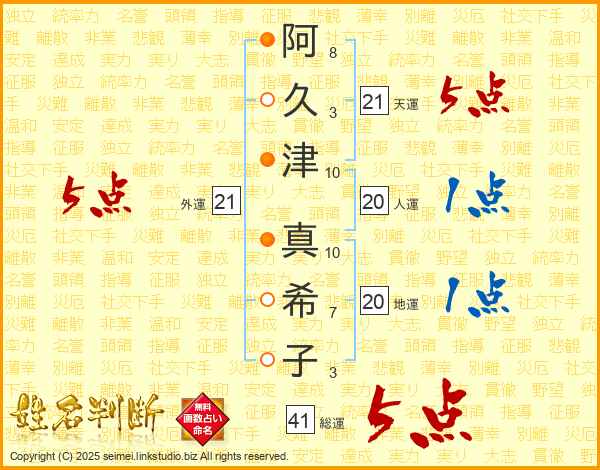 阿(8画)久(3画)津(10画) 真(10画)希(7画)子(3画)