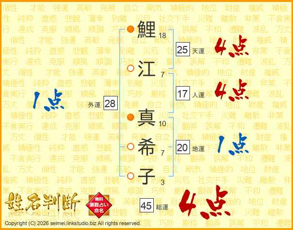 鯉(18画)江(7画) 真(10画)希(7画)子(3画)