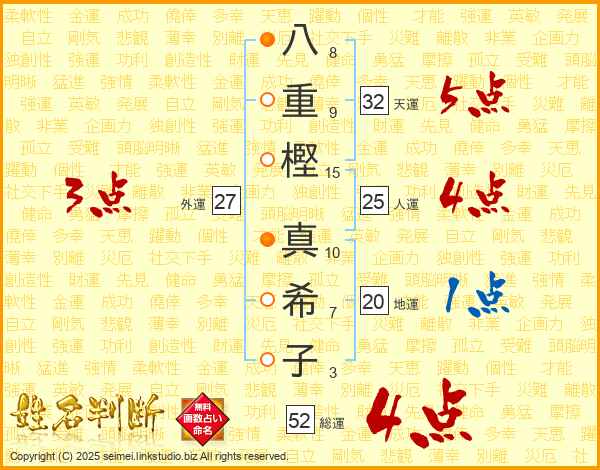 八(8画)重(9画)樫(15画) 真(10画)希(7画)子(3画)