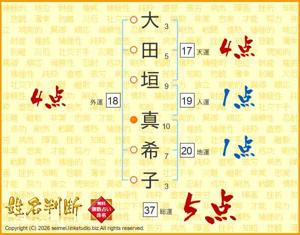 大田垣真希子さんの総運は37画の5点!