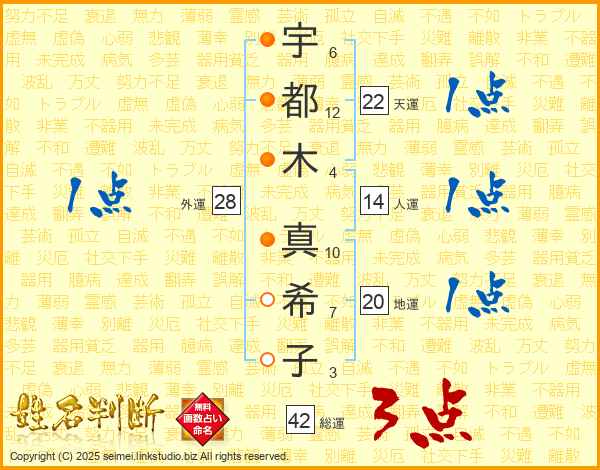 宇(6画)都(12画)木(4画) 真(10画)希(7画)子(3画)