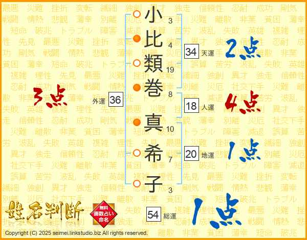 小(3画)比(4画)類(19画)巻(8画) 真(10画)希(7画)子(3画)