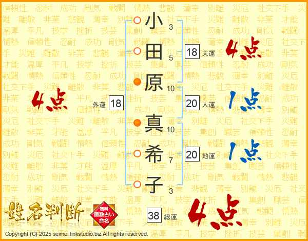 小(3画)田(5画)原(10画) 真(10画)希(7画)子(3画)