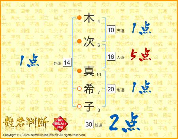 木(4画)次(6画) 真(10画)希(7画)子(3画)