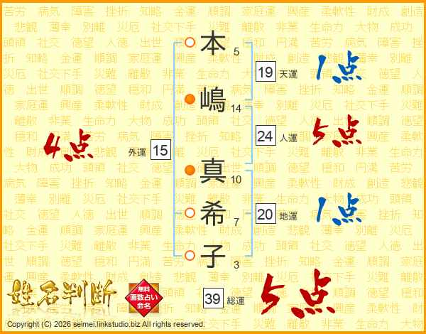 本(5画)嶋(14画) 真(10画)希(7画)子(3画)