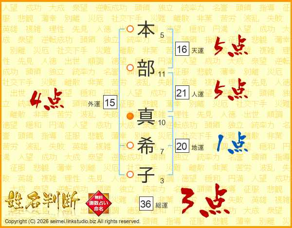 本(5画)部(11画) 真(10画)希(7画)子(3画)