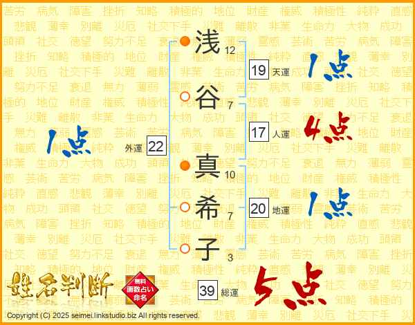 浅(12画)谷(7画) 真(10画)希(7画)子(3画)
