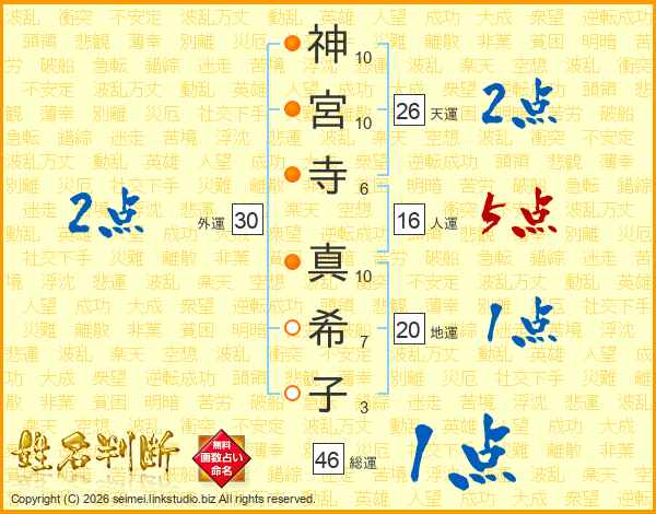 神(10画)宮(10画)寺(6画) 真(10画)希(7画)子(3画)