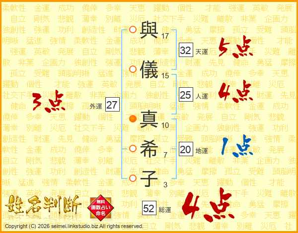 與(17画)儀(15画) 真(10画)希(7画)子(3画)