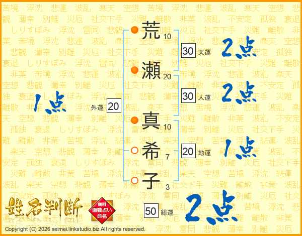 荒(10画)瀬(20画) 真(10画)希(7画)子(3画)