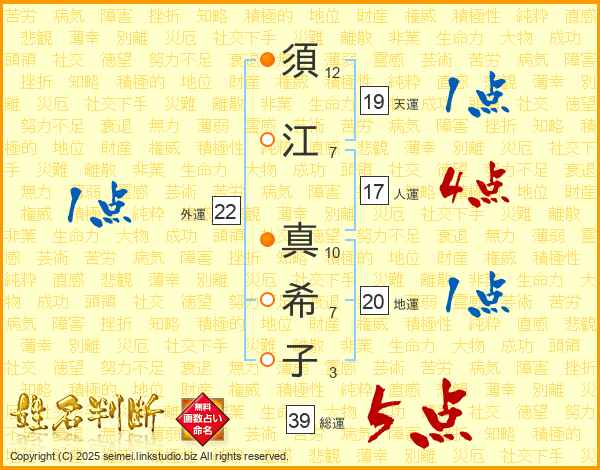 須(12画)江(7画) 真(10画)希(7画)子(3画)
