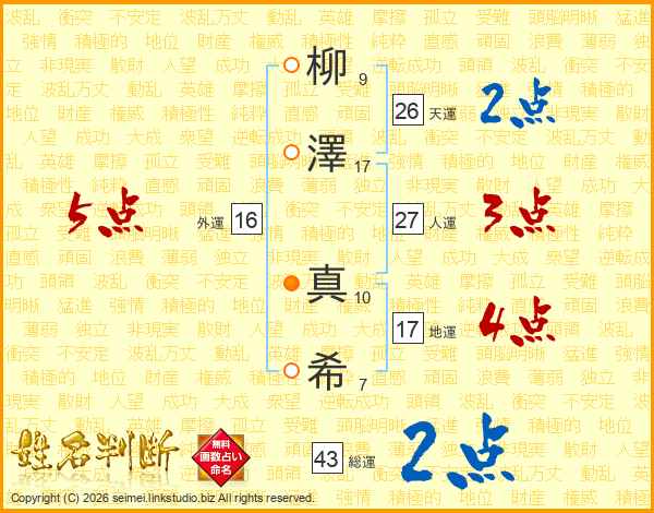 生活面を象徴する運勢です。外部から受ける影響力を表し、結婚運、家庭運や職場、環境への順応性を表します。総運から人運を引いた画数。姓や名が1文字の場合を除く。