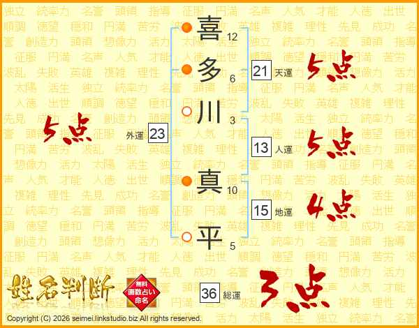 喜(12画)多(6画)川(3画) 真(10画)平(5画)