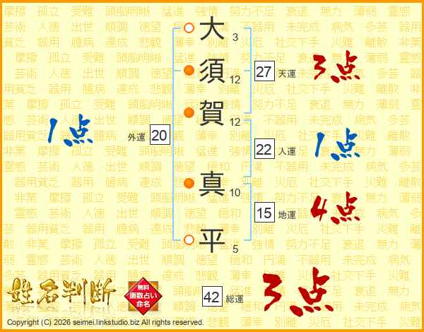 大(3画)須(12画)賀(12画) 真(10画)平(5画)