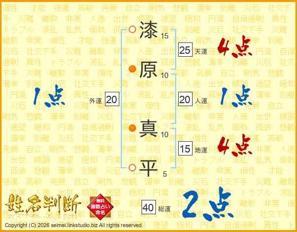 生活面を象徴する運勢です。外部から受ける影響力を表し、結婚運、家庭運や職場、環境への順応性を表します。総運から人運を引いた画数。姓や名が1文字の場合を除く。